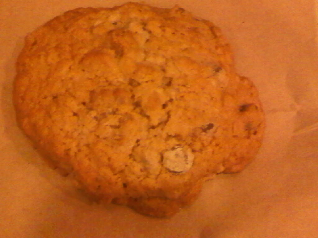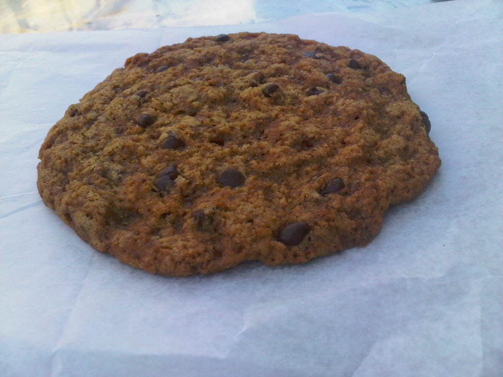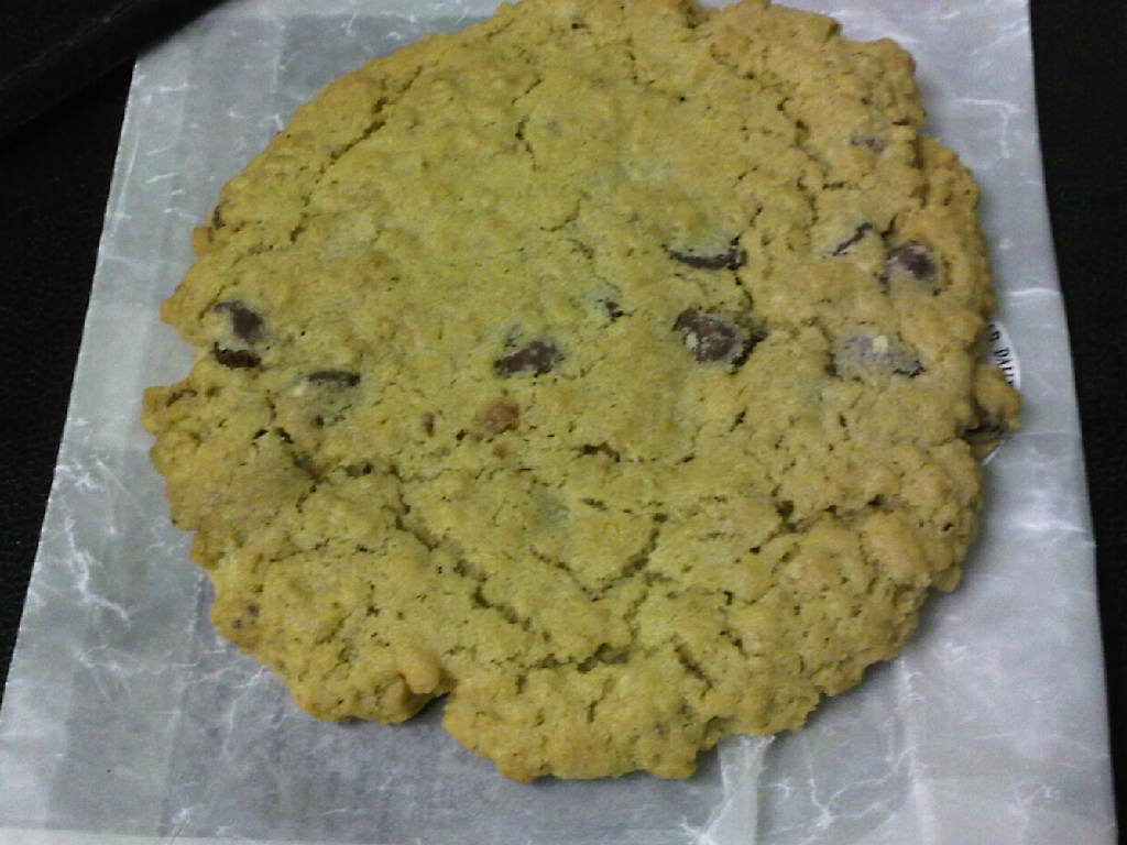 Taste: The cookie is a lot softer than it looks, despite its large size.  It’s not super-filled with chocolate chips (then again, it is a big cookie), but the chips are tasty.  There’s more of an oatmeal cookie taste to it.
