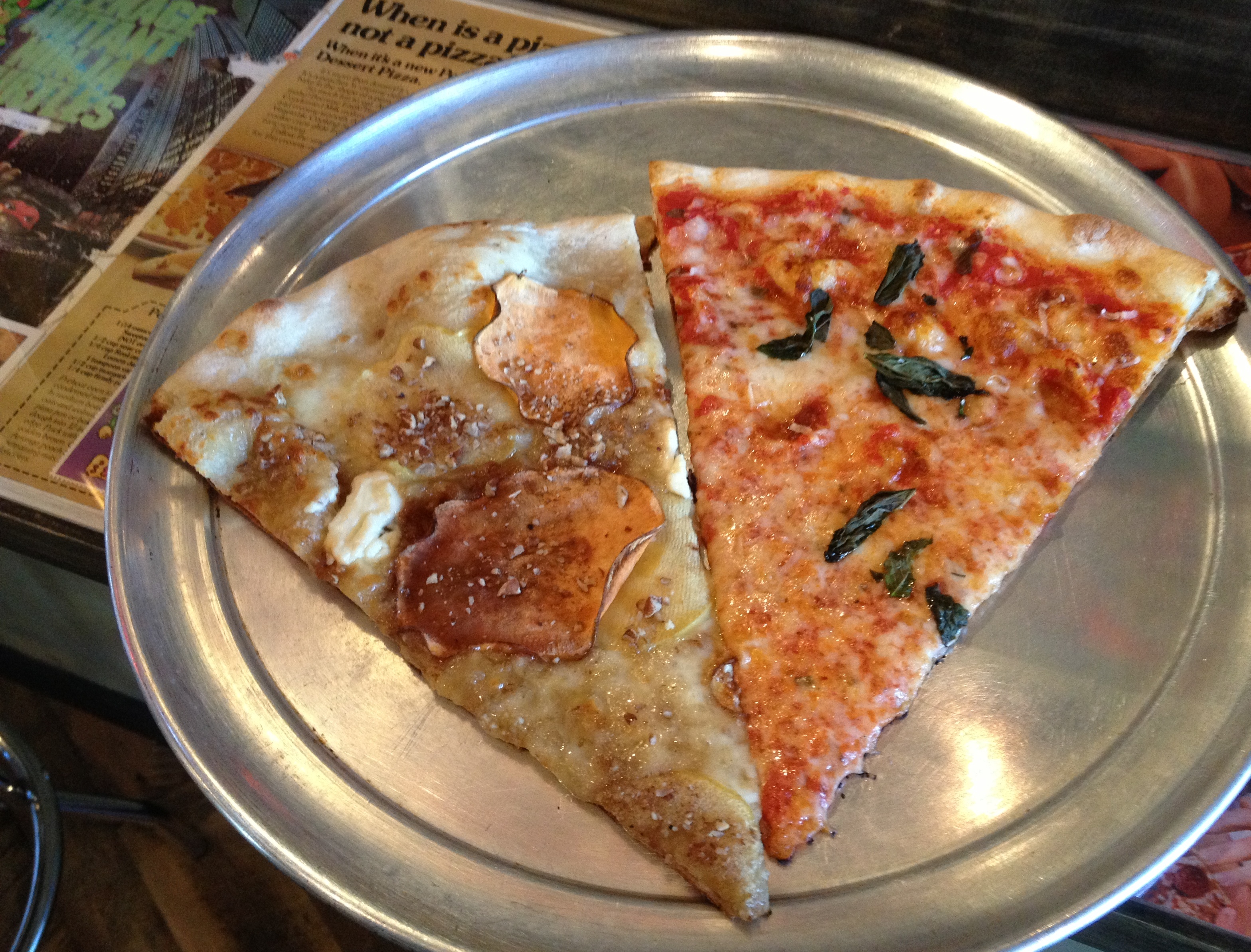 Each Pizza Brain slice is cut from 20 inch pies, so the slices are enormous. On my first visit, I had both the Jane ($3) and the Charlie Mayfer ($3.50) slices. The Jane is relative plain, but by no means is it ordinary. The slice combines three different cheeses (mozzarella, aged provolone, grana padano) with hand-crushed tomato sauce and is topped with fresh basil. Meanwhile, the Charlie Mayfer is a white pizza with mozzarella, sweet potato, honey crisp apple, honey goat cheese and brown sugar.